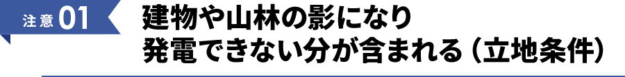 周りに建物や木などの障害物がある場合は、太陽光パネルに影が落ちるため、計算より実際の発電量が少なくなります。