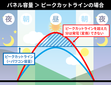 太陽光発電の発電量は日中に最大になります。しかし発電された電力をすべて売電できるわけではなく、発電した電力を変換するパワーコンディショナーの出力を超える分は売電できません。