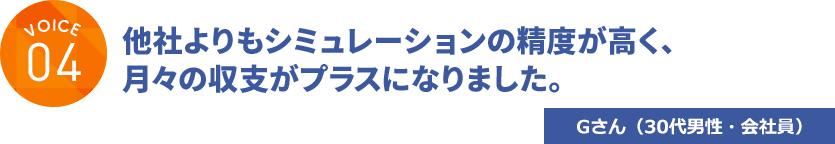 弊社で投資を始められたお客様からは、「実際の収支とシミュレーションに大きな差がなかった」とご満足の声をいただいています。